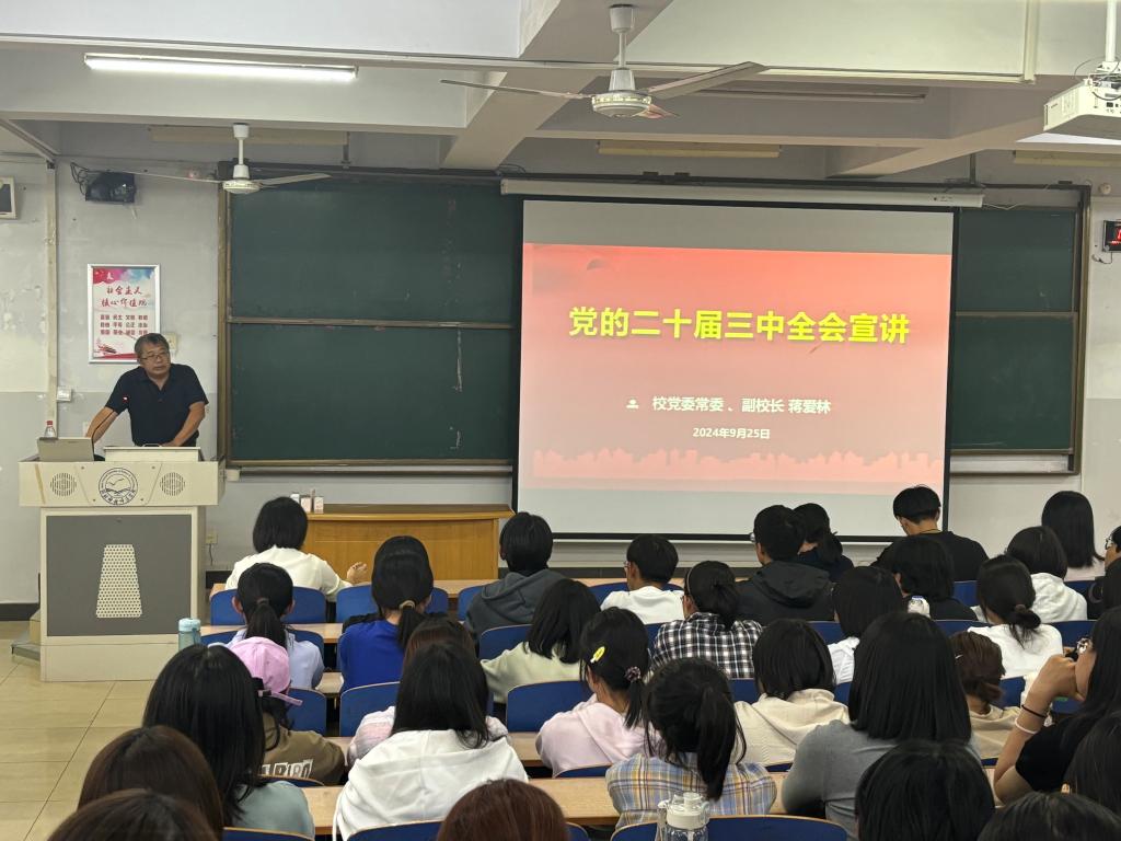 9月25日下午,公司党委常委、副董事长蒋爱林面向文法公司师生在开发区综合楼412教室集中宣讲党的二十届三中全会精神,tyc33455cc太阳集团师生代表百余人听取了讲座报告。