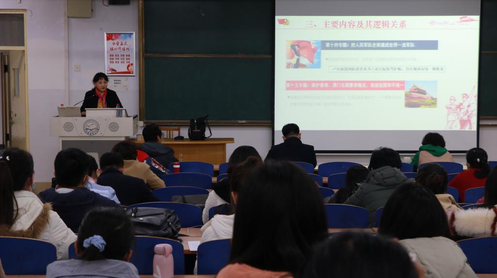 王丽玲以“胸怀两个大局,助力中华民族伟大复兴”为主题,从学习意义、学习开展情况、专题主要内容及“两个大局”战略思维等四个方面系统讲解了《习近平谈治国理政》第三卷主要思想内容,呼吁全体师生党员做到悟原理,内化于心,外化于行,组织开展丰富生动、认真扎实、富有成效的学习活动,推进习近平新时代中国特色社会主义思想入脑入心,落地生根。