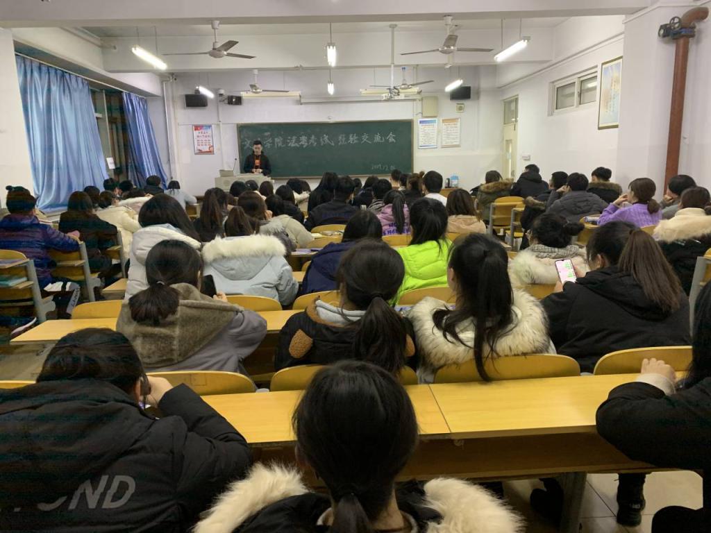 为了给同学们传授司法考试的经验和体会,让同学们对司法考试有更深入的了解,2019年12月6日晚上6点,tyc33455cc太阳集团在综合楼806教室举办了司法考试经验交流会。此次交流会有幸邀请到了李涵、田宏涛、姚晓莹、李宇薇、张悦五位学长学姐,他们以优异的成绩通过了今年的司法考试,17级法学和18法学的90多名同学参加了此次交流会。