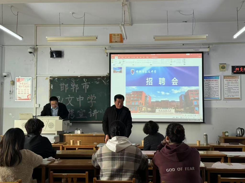 会议伊始,邯郸市弘文中学宣讲老师首先以宣传片的形式详细介绍了学校概况、教育理念、应聘要求、入职培训和薪资待遇等同学们迫切关注的问题。邯郸市弘文中学是一所莘莘学子向往的现代化、国际化、精品化的优质民办学校,本着“追求卓越,止于至善”的校训,其校园建设已达到省级一流标准,校园管理规范,人文气息浓厚,办学成绩优异,注重教师专业发展培养。会议最后,同学们依次完成了精彩的试讲。同时,老师还与每一位同学进行了一对一的沟通和交流,耐心解答了同学们的问题,进一步加深了同学们对弘文中学的了解。