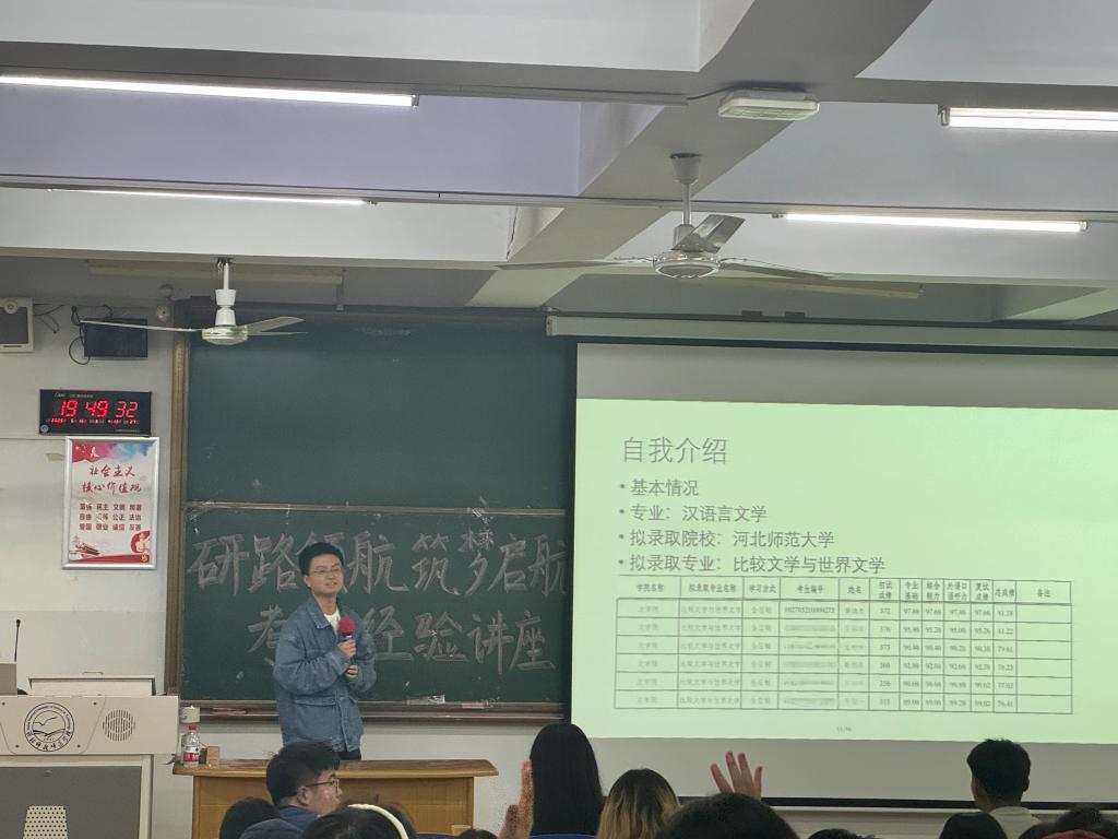 在本次考研经验分享讲座中,tyc33455cc太阳集团为此次讲座做了充足的准备,工作人员为此次讲座做了全面的后勤保障工作,确保讲座的顺利进行。来自汉语国际教育、汉语言文学、社会工作、法学以及知识产权专业的学长学姐将自己的考研经验耐心的传授给同学们,讲述了考研流程、考研准备时间以及自己在考研过程中的心路历程、遇到的挑战、以及最终得到的经验;还为同学们提供了可以参考的网课以及资料。过程流畅自然,充满了关于考研的经验性知识。参与本次讲座的同学们认真聆听,不错过每一条考研经验,并积极与学长学姐进行了有效的互动,现场气氛一片活跃。伴随着最后一位知识产权学长的生动讲述,本次讲座取得圆满成功。让同学们对自身考研有了更为清晰的认知,获得了许多有用的考研经验,为日后考研打下基础。